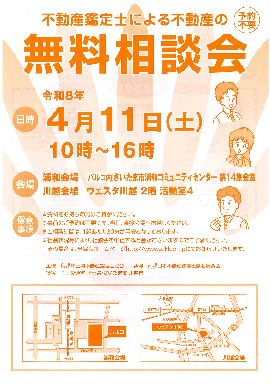 県民の方々を対象として、不動産価格、不動産に係る権利の価格、不動産賃料及び不動産を取り巻く諸問題解決のため、恒例の春の無料相談会を令和8年4月11日(土)にさいたま浦和と川越の2会場で開催します。事前予約は不要です。詳しくは、下記チラシをご覧ください。