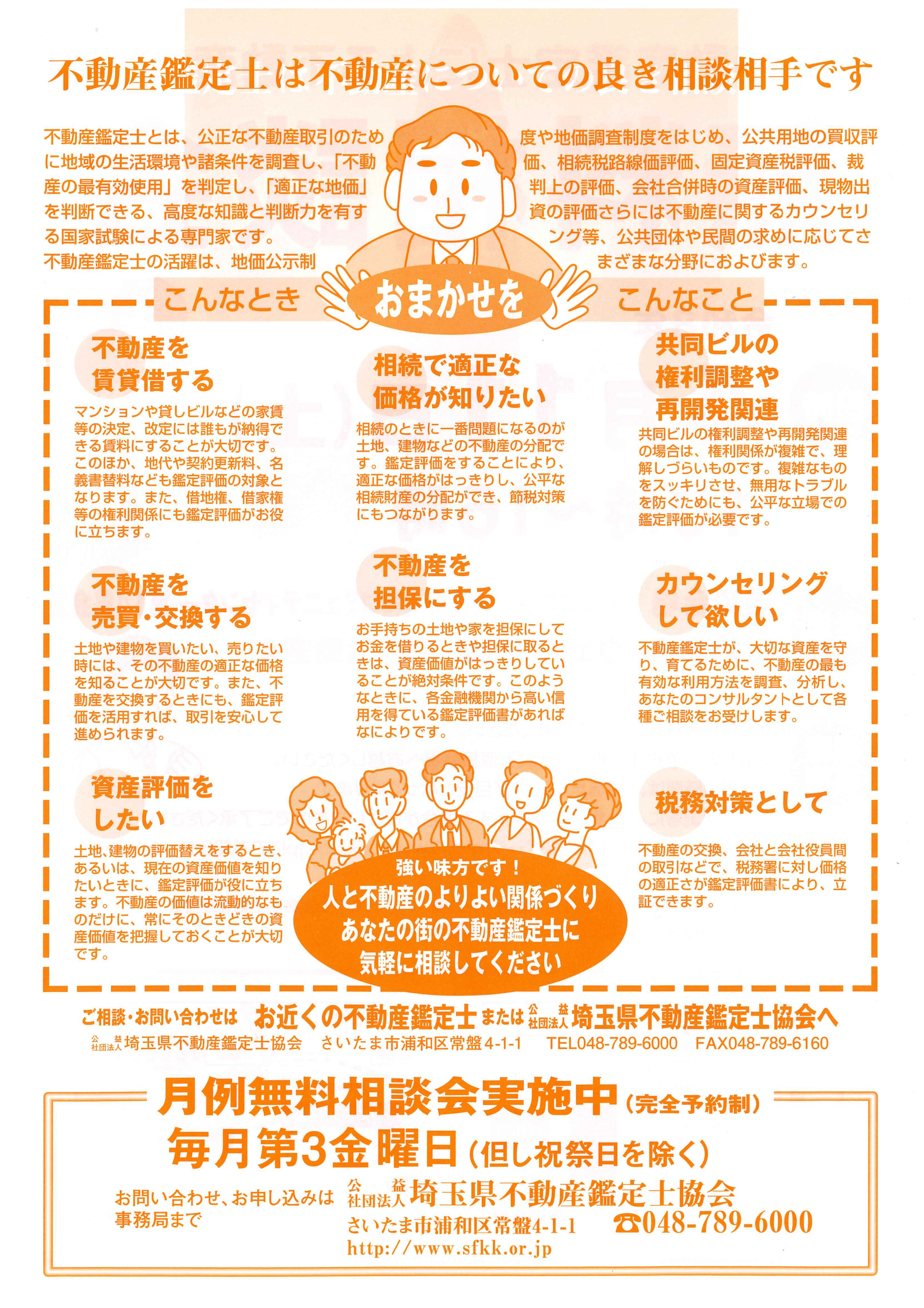 当協会はじめ専門士業11団体で構成する埼玉県友好士業協議会(当番会:埼玉司法書士会)で「暮らしと事業のよろず相談会」を開催いたします。当相談会は当協会から参加する不動産鑑定士のほか、弁護士、税理士など11の専門士業との相談が可能で、予約不要・相談料無料です。多くの方のご来場をお待ちしております。なお、詳細は下記のチラシをご参照ください。