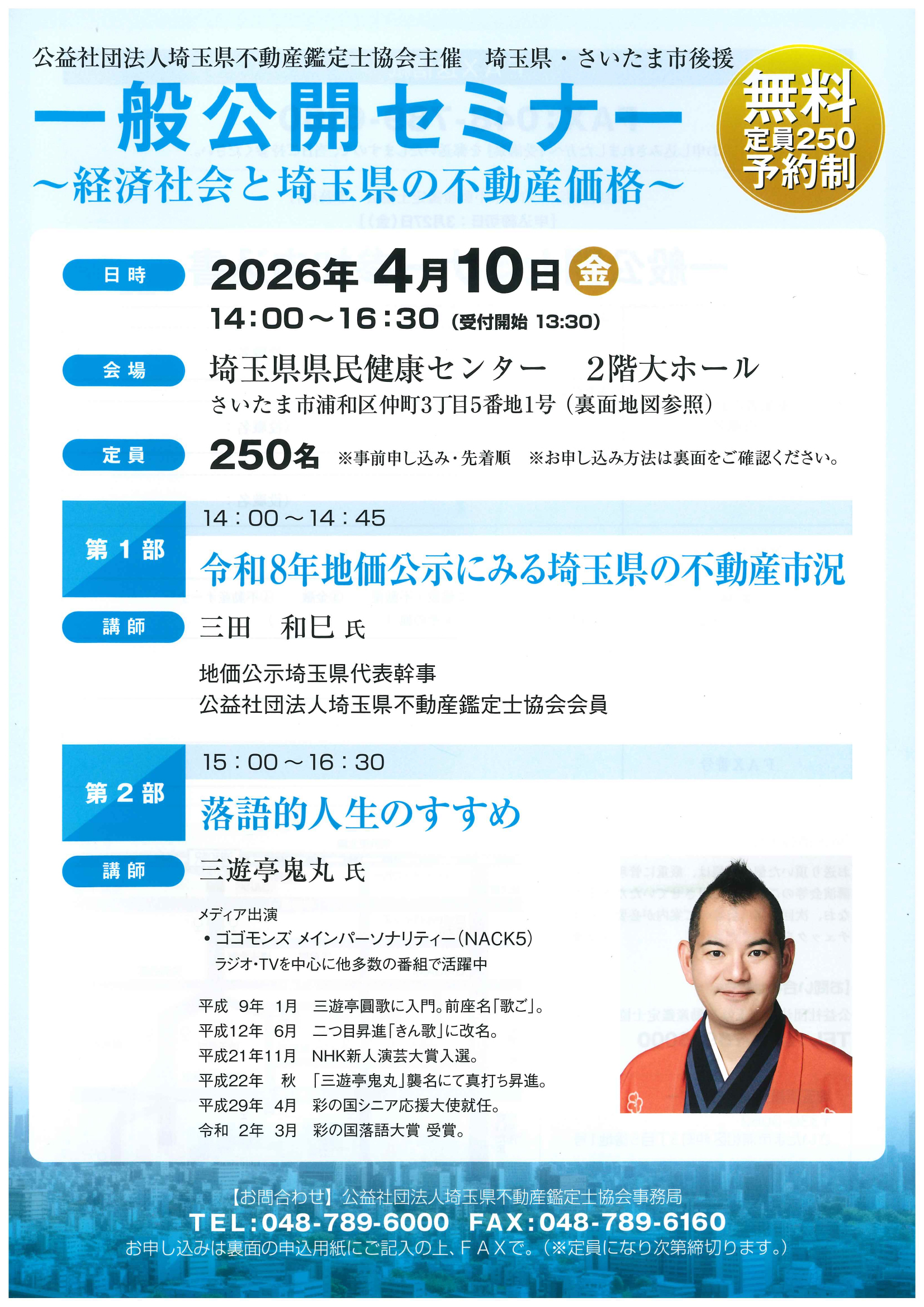 今回は、令和8年4月10日(金)に埼玉県県民健康センターにおいて、第1部では地価公示埼玉県代表幹事・当協会会員 三田 和巳 氏に埼玉県の不動産市況について、第2部では、現在、ラジオ・テレビを中心に多数の番組で活躍されている落語家の 三遊亭 鬼丸 氏に「落語的人生のすすめ」について講演いただきます。